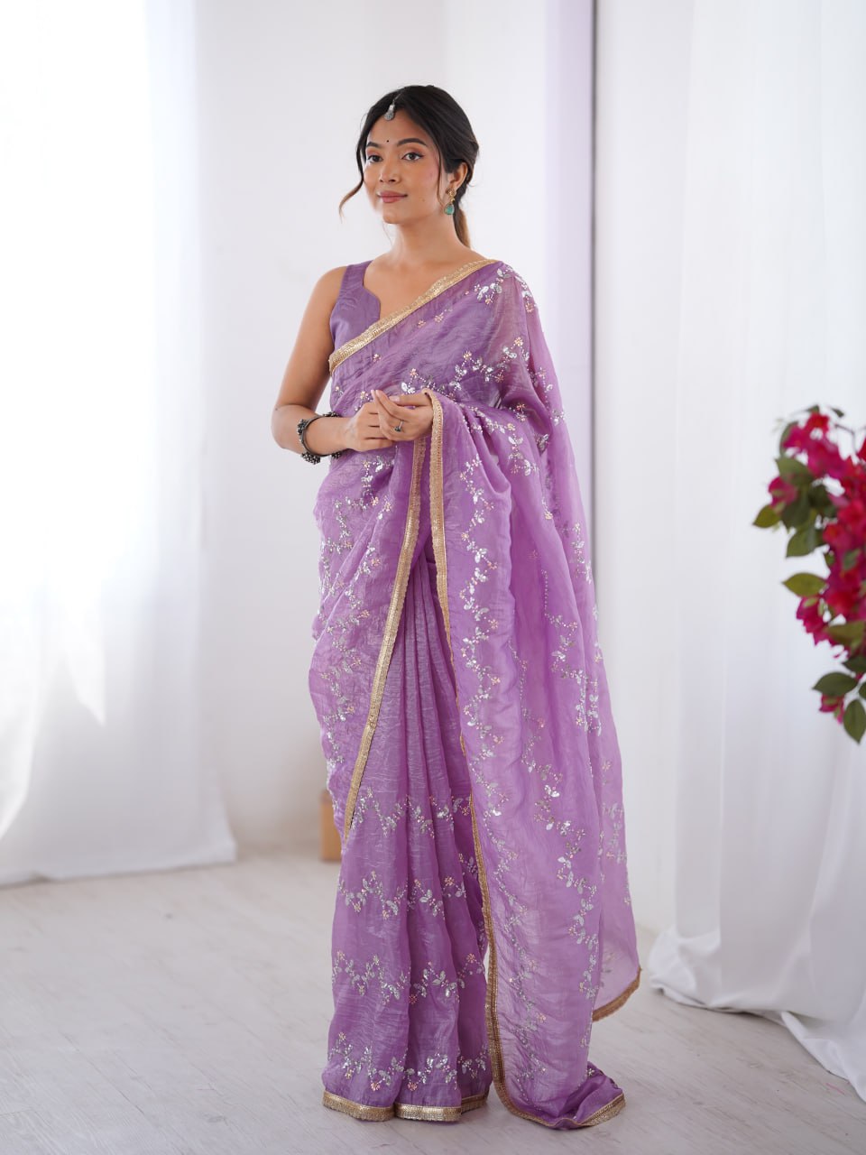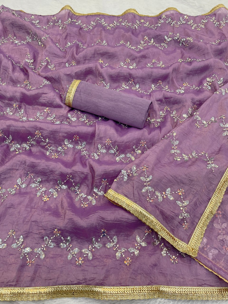 ✔️Pattern :-: Beautiful Designer Moti & Val ZigZag Striped Sequin Embroidery Base Work In Allover Saree